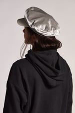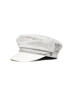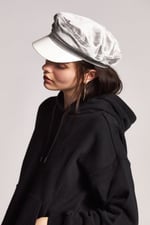 The Ashland is a cut and sew sailor cap with custom lining and a double row of cord with custom buttons on the sides and white visor in contrast by Brixton. Made in shiny aluminium grey pattern, satin lining and a trendy piece for women.