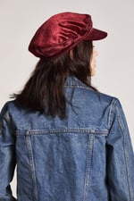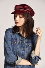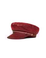 The Ashland is a cut and sew sailor cap with custom lining and a double row of cord with custom buttons on the sides by Brixton. Made in velvety burgundy red, satin lining and a trendy piece for women.