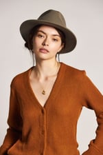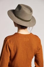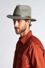 Un sombrero básico de fieltro de lana en color verde salvia y ala ancha hecha por Brixton. Muy cómodo de llevar, fácil de combinar y éste lleva el ala planchada haciendo que se mantenga casi plana. Lleva una banda de cuero sintético verde en la copa para contrastar el gris, dándole el toque sport.