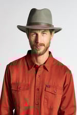 A basic sport wide brim sage green wool felt hat made by Brixton. Super confortable to wear, easy to fit and this one with stiffened brim making it holding almost flat. It features a faux green leather band to contrast the sage making it a sporty hat.