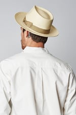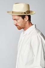 El Presley es un sombrero tipo fedora de ala ancha teñido en un tono hueso precioso, hecho por los chicos de Brixton. Este modelo viene con cinta grosgrain y un forro tipo seda para mayor protección contra los rayos solares. Se puede llevar como sombrero sport o formal, levantando o bajando la parte frontal del ala.