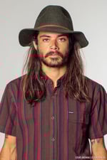 El Wesley es un sombrero de fieltro de lana sport hecho por Brixton, con el ala sin terminar y con cinta de cuero alrededor de la copa. La copa está planchada (no pierde la forma) pero el ala se ondula por su propio peso. Este en particular está teñido en una preciosa mezcla de verdes.