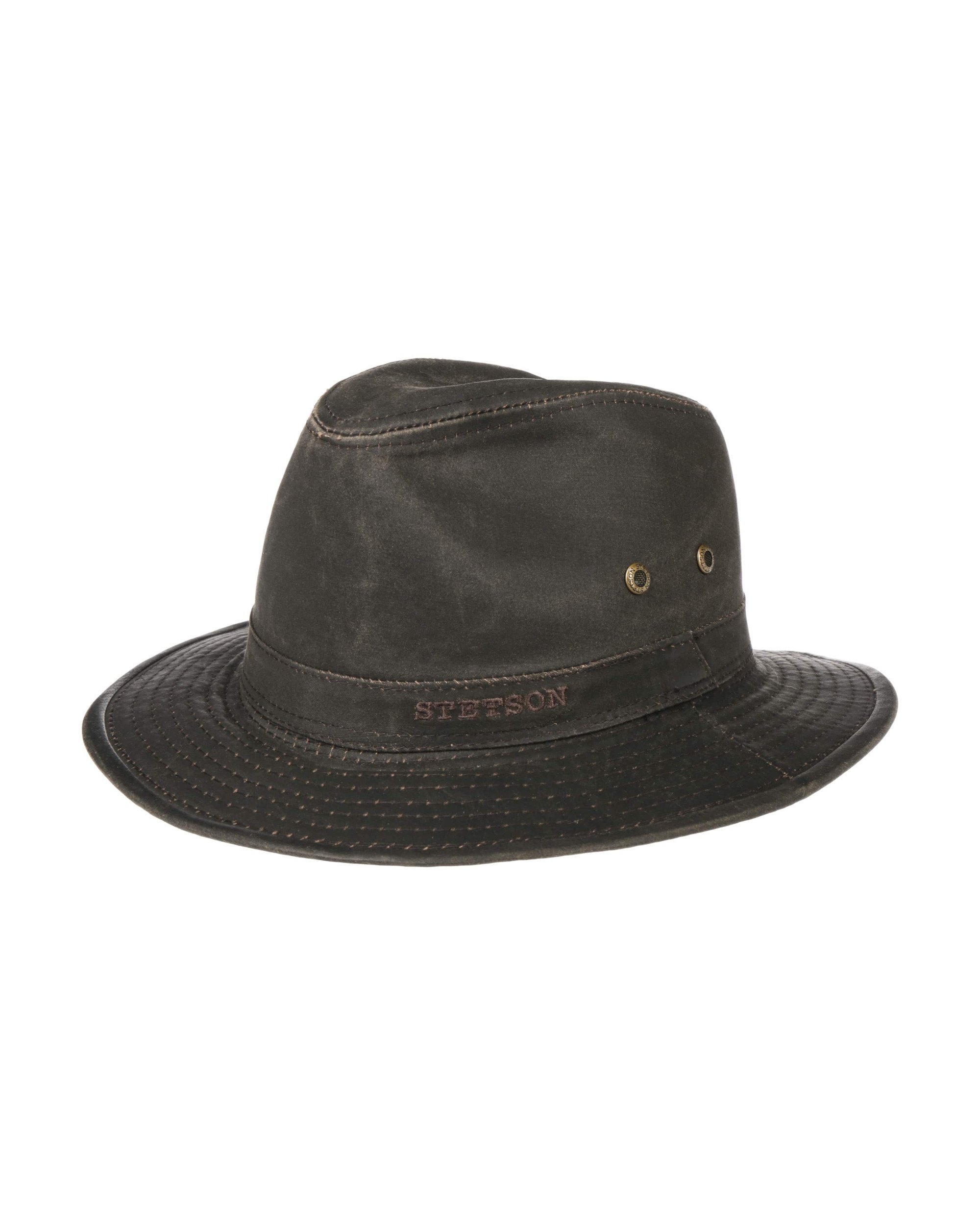 Another top sales for summer. The Ava is an outdoor sport summer hat, featuring a medium brim snapped down all around for more protection, made by Stetson of this classic worn waxed cotton in brown and lightly stiffened just to fix in shape. It also features two metal eyelets on each side to let the warmth go out easier. As a cotton hat, it has UV Protection 40+, so it won't crush or let the sun permeate into the hat. It's main advantage, unlike any other summer material, is its low requirement of maintenance.