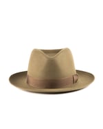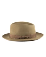 This is a classic medium brim fedora in a bogart style made by Stetson. Seamless, soft and confortable made with the finest fur felt, this model has a grosgrain ribbon trim in a matching color, a very thin inner fabric band and a satin lining. Easy to wear and timeless classic, it's able to turn the front of the brim up or down to give it more personality.