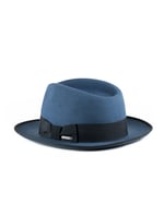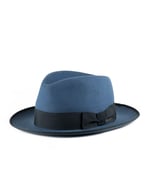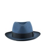 A classic wide brim fedora from Stetson made with 100% rabbit fur felt, gives to this hat a crushable properties for more confort. The grosgrain ribbon trim is contrasted as well as the edge of the brim to give it more personality to this beautiful blue hat. You can turn up or down the front of the brim to become it into a classical or modern hat.